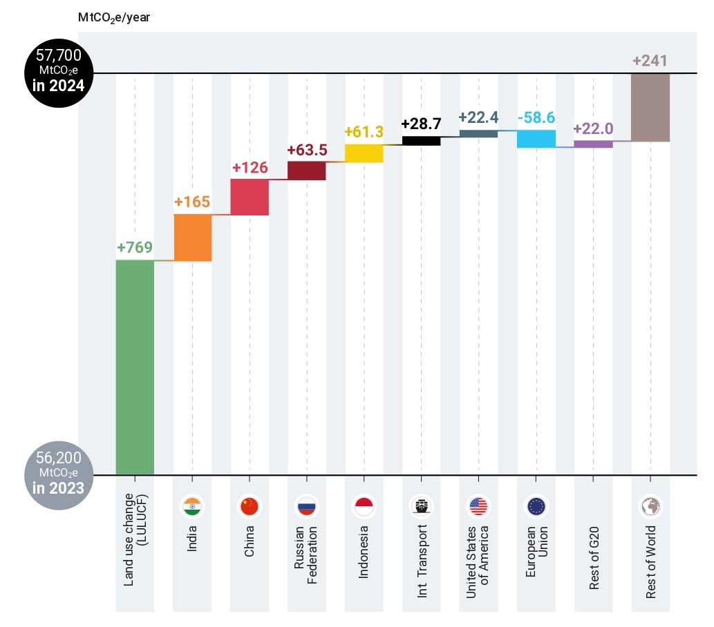 According to UNEP’s latest Emissions Gap Report, the EU-27 was the only region to reduce its emissions between 2023 and 2024, cutting them by 58.6 million tonnes of greenhouse gases, while global emissions increased by 1.4 billion tonnes overall. The main driver of this reduction was the land use, land-use change, and forestry (LULUCF) sector, while countries such as India and China increased their climate footprint by 769 million, 165 million, and 126 million tonnes, respectively, over the same period.